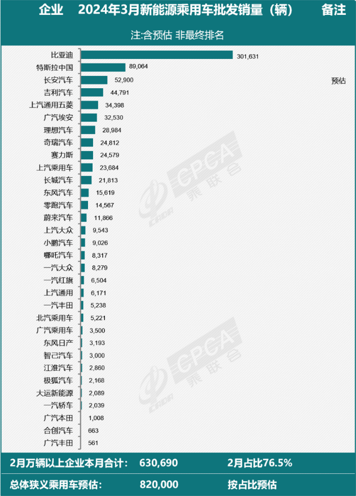 新能源汽车方面,3月份新能源车市场零售69.8万辆,同比增长28%,环比增长80%,今年以来累计零售175.8万辆,同比增长34%;全国乘用车厂商新能源批发81.9万辆,同比增长33%,环比增长83%,今年以来累计批发195.6万辆,同比增长31%。